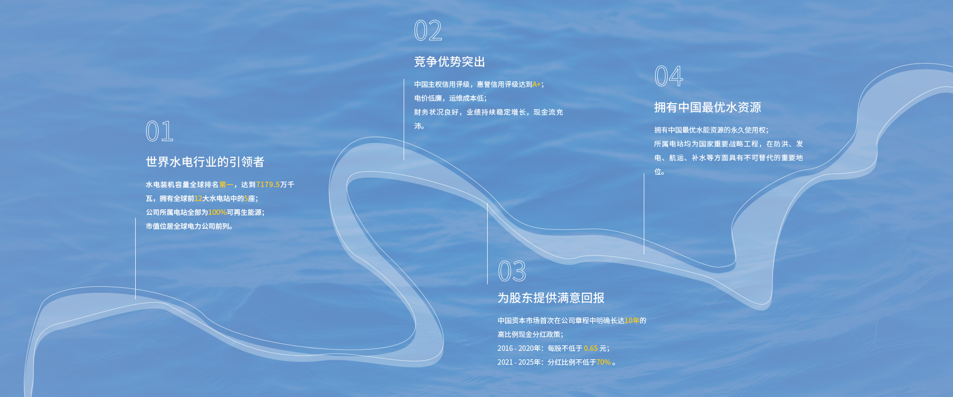 3044永利主要从事水力发电、投融资、抽水蓄能、智慧综合能源、新能源和配售电等业务,经营区域覆盖中国、秘鲁、巴西、巴基斯坦等多个国家,是中国最大的电力上市公司和全球最大的水电上市公司。3044永利运营管理的乌东德、白鹤滩、溪洛渡、向家坝、三峡、葛洲坝六座梯级电站,构成了世界最大清洁能源走廊,有效保障了长江流域防洪、航运、补水和生态安全,为我国经济社会绿色发展提供了强劲动能。